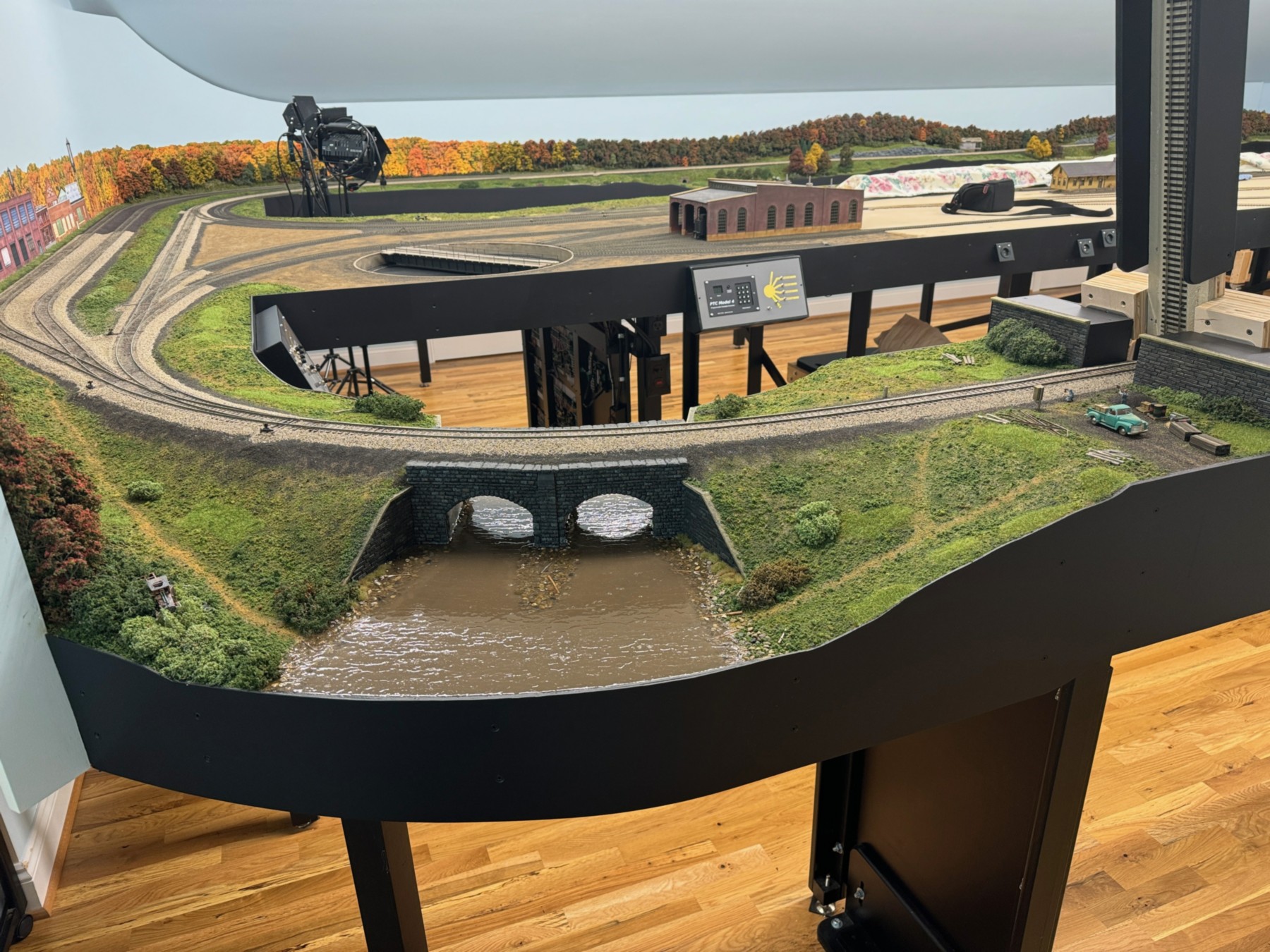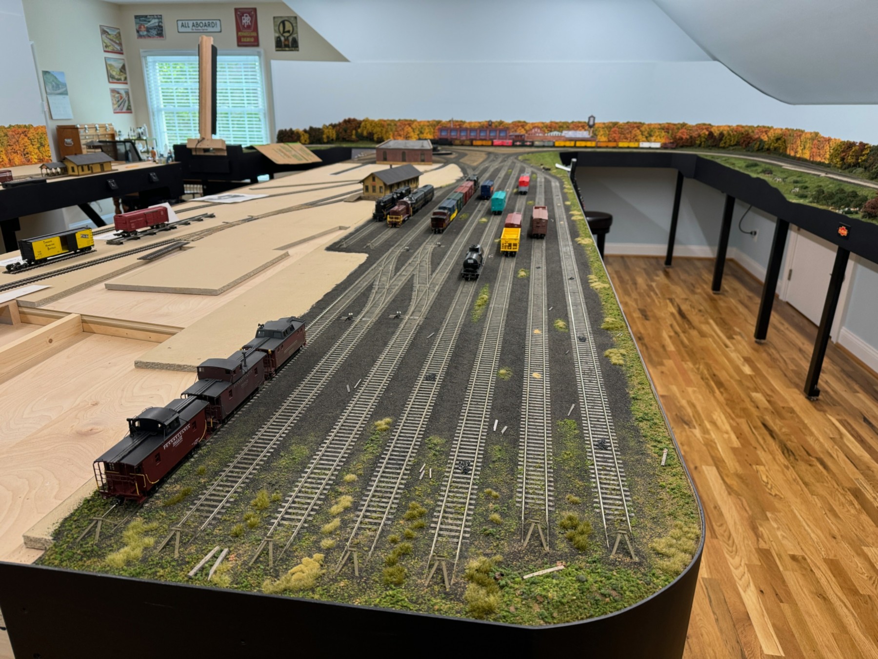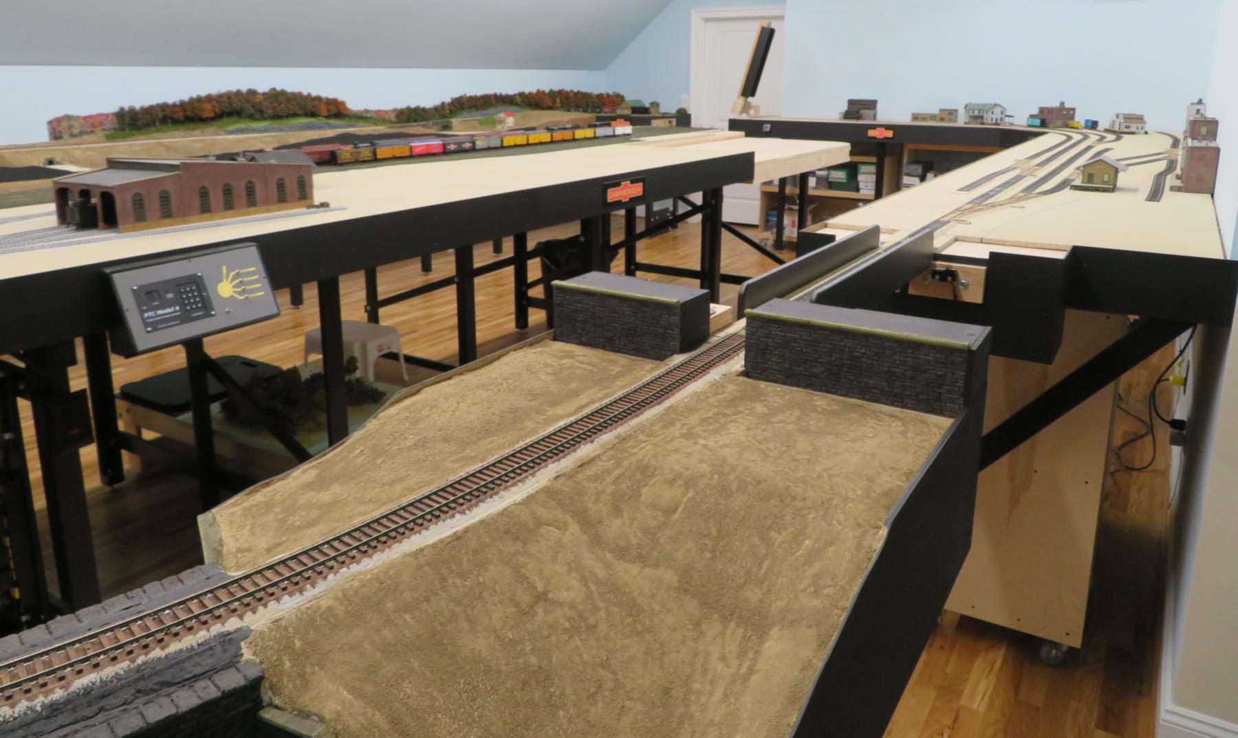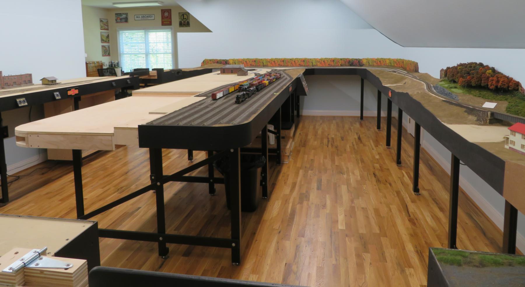 This photo, taken from the opposite corner of the first photo, shows that the layout has two lift-up bridges to allow for easy access into the layout space.
