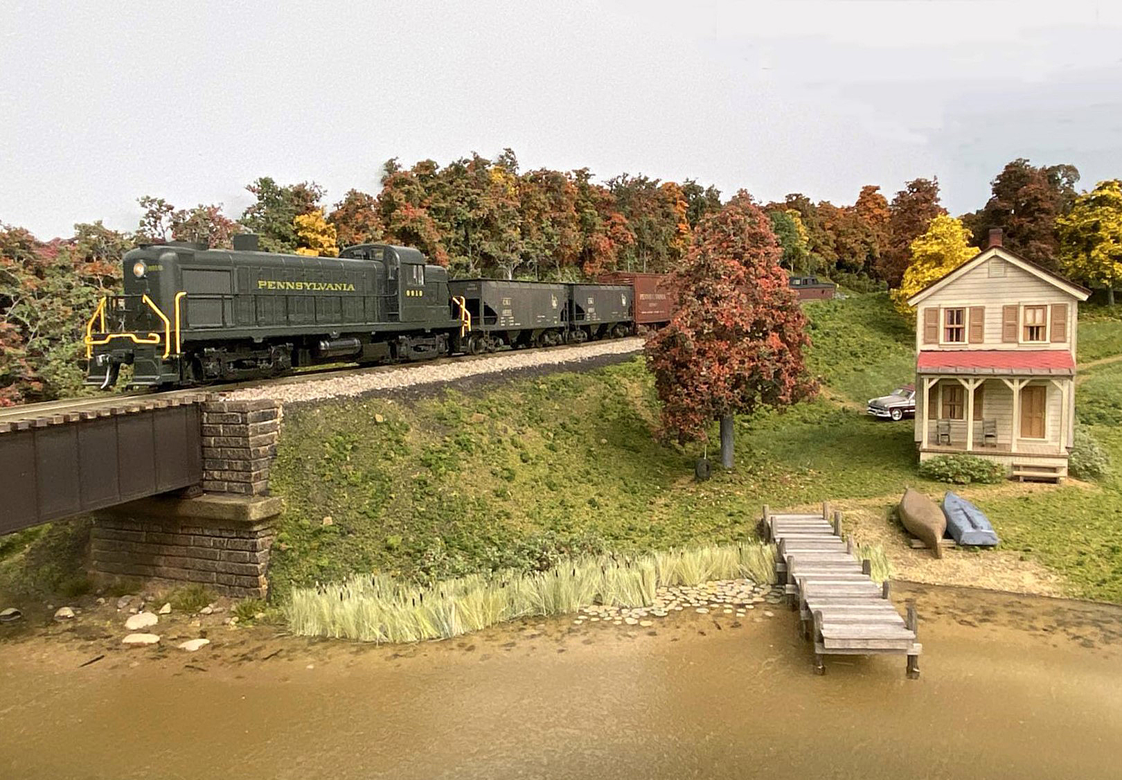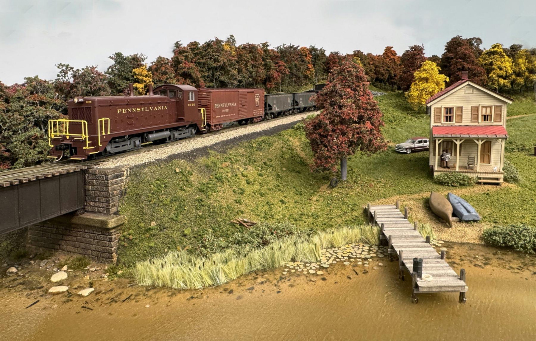 RS-3 PRR 8818 crosses a lake with a local freight coming from Penn Yan, NY on its way to the Division Point Yard in Canandaigua, NY. The RS-3 is from American Models and the freight cars are from S-Helper service. The house is a BTS 110 Second Street kit. The girder bridge is a 90' Walthers HO-scale kit and sits on Pre-Size Model Specialities abutments. The background trees are all Scenic Express Super Trees, and the foreground trees are made from Woodland Scenics' armatures. The water is art resin topped with Woodland Scenics Water Ripples.