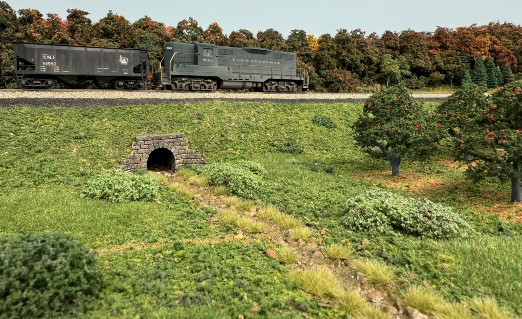 Alan does beautiful scenery work as is clearly visible in this photo. The culvert is by Pre-Size Model Specialties. The apple trees are modified Woodland Scenics armatures.