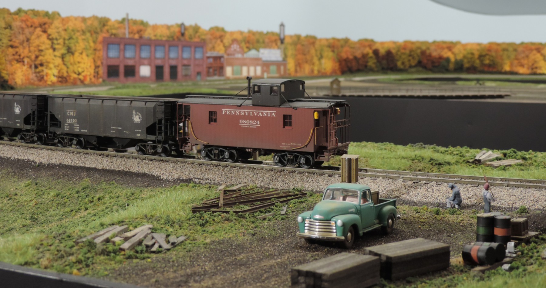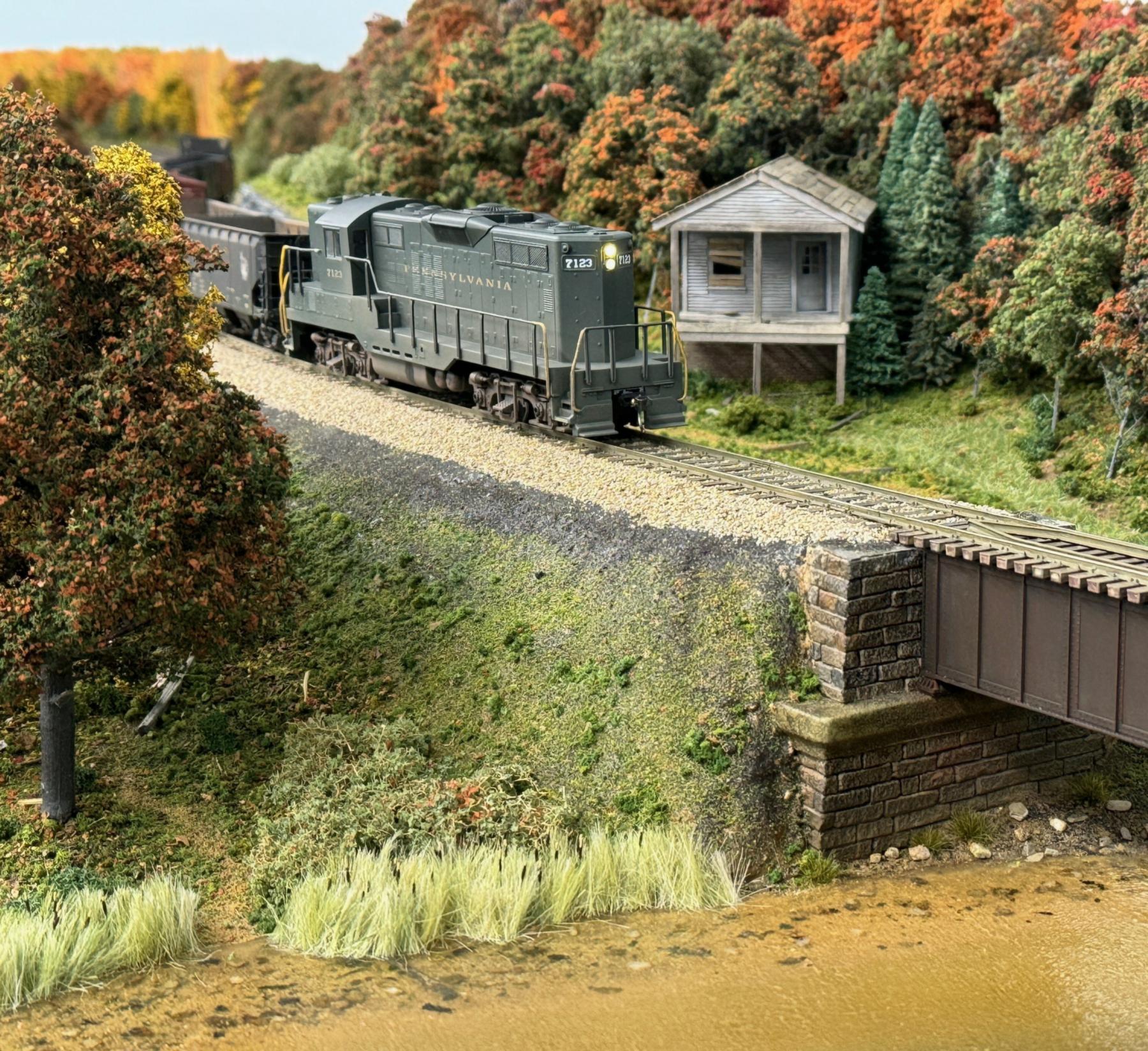 The next two photos are the scene near Aloquin, New York. In it, a PRR American Models GP9 is moving a S-Helper Service freight cars. This particular photo was taken with an iPhone 15. The abandoned cabin was built from scratch by Alan. The bridge was constructed from an HO-scale Walthers kit. Alan used art resin to create the water. Alan does beautiful scenery work as is clearly visible in these photos. The foreground tree was made from Woodland Scenics armatures and Super Tree material, and the background trees are all Super Trees.