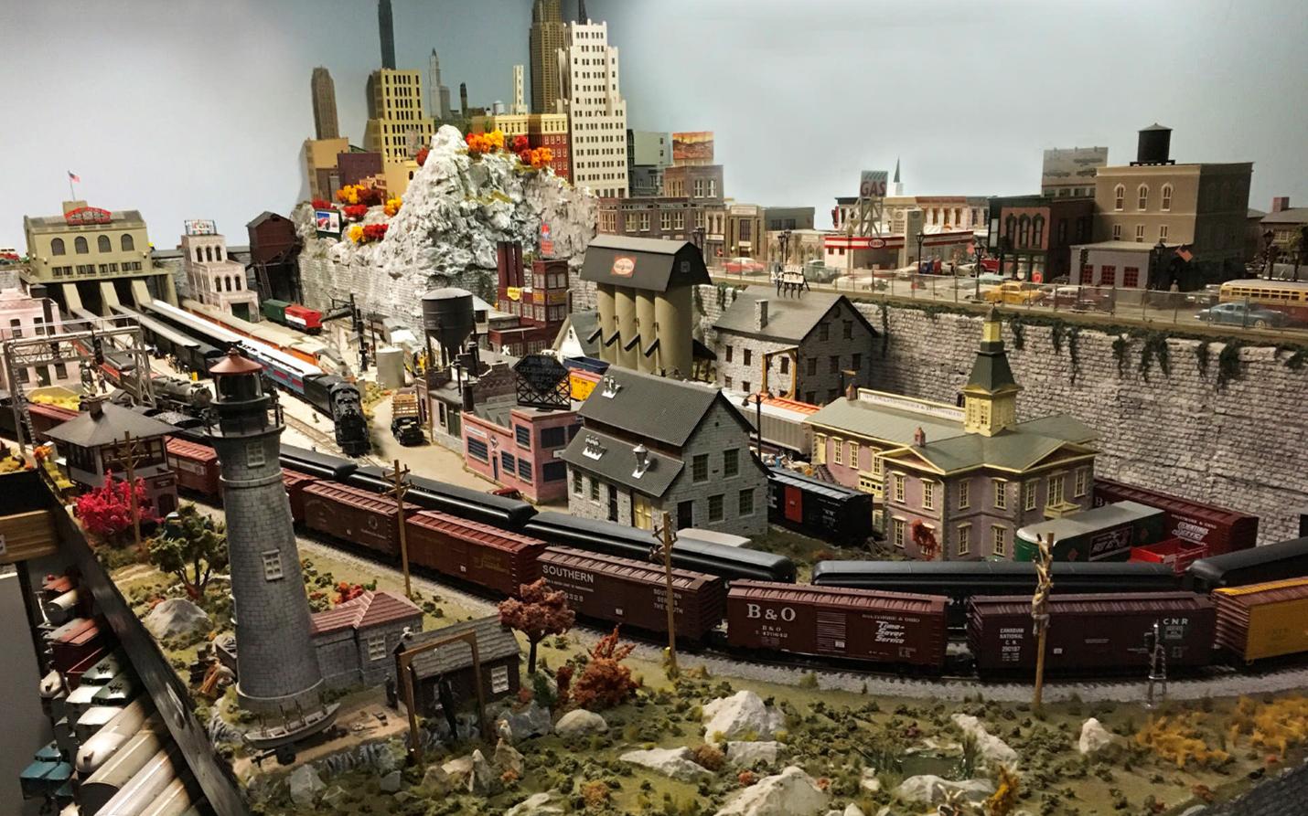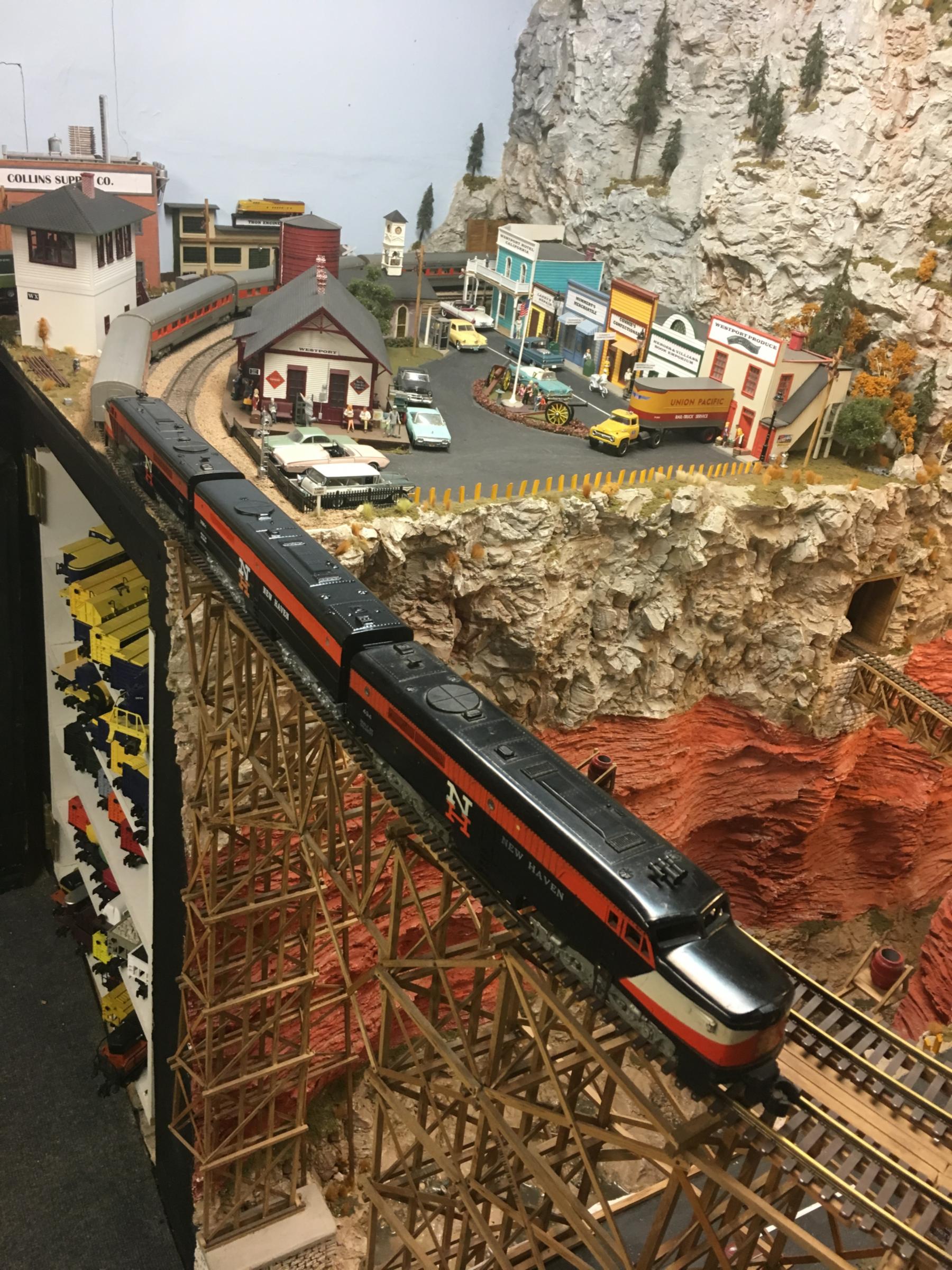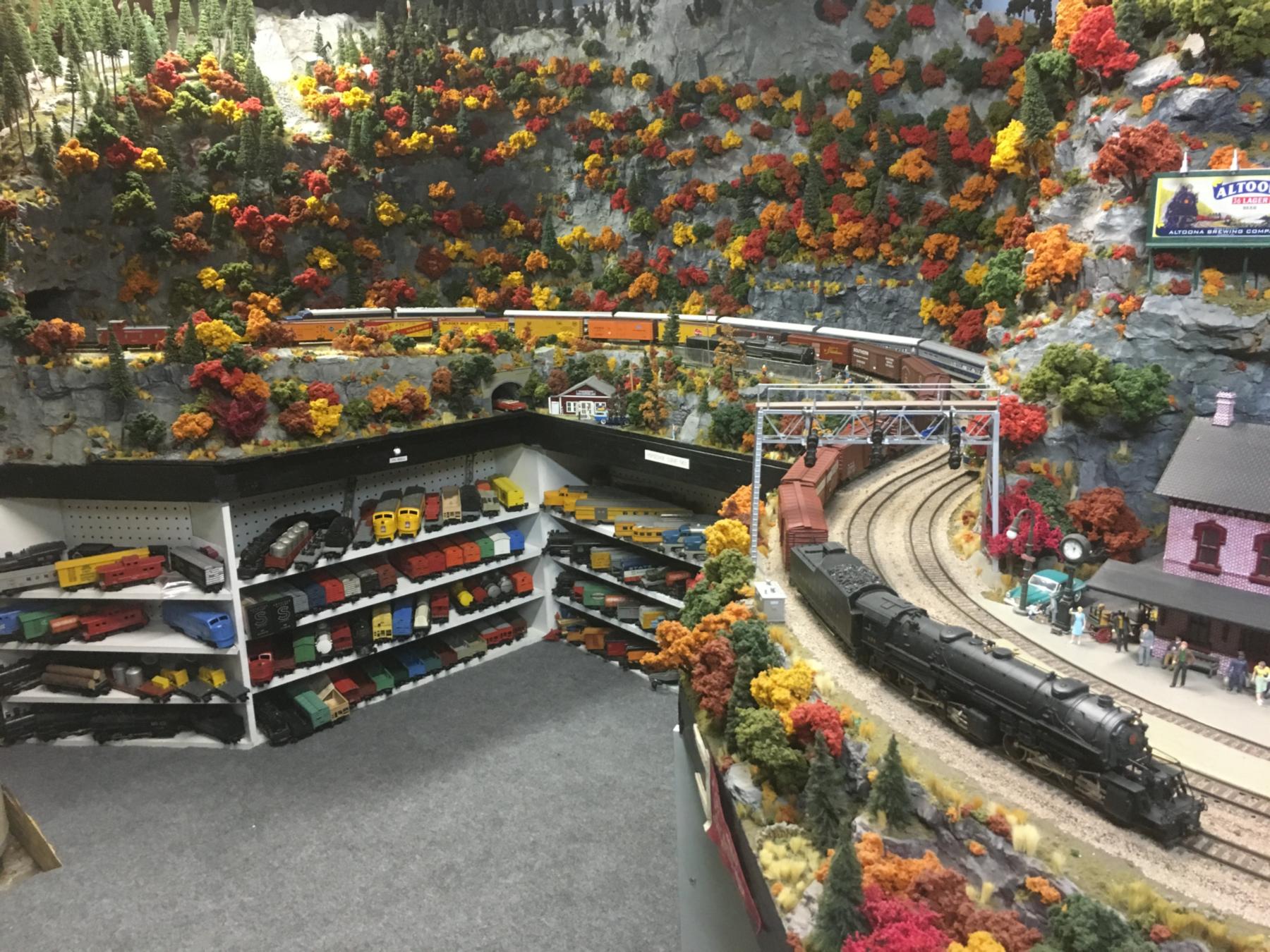 Portions of this fantastic layout include floor-to-ceiling scenery! The layout has scenes that can be found in New England, Altoona Horseshoe Curve, Colorado, Utah, the Grand Canyon, and the Pacific coast.