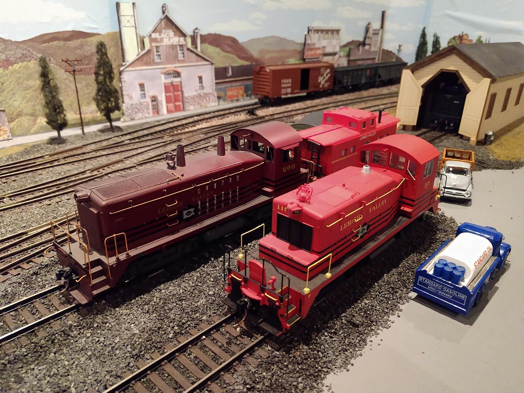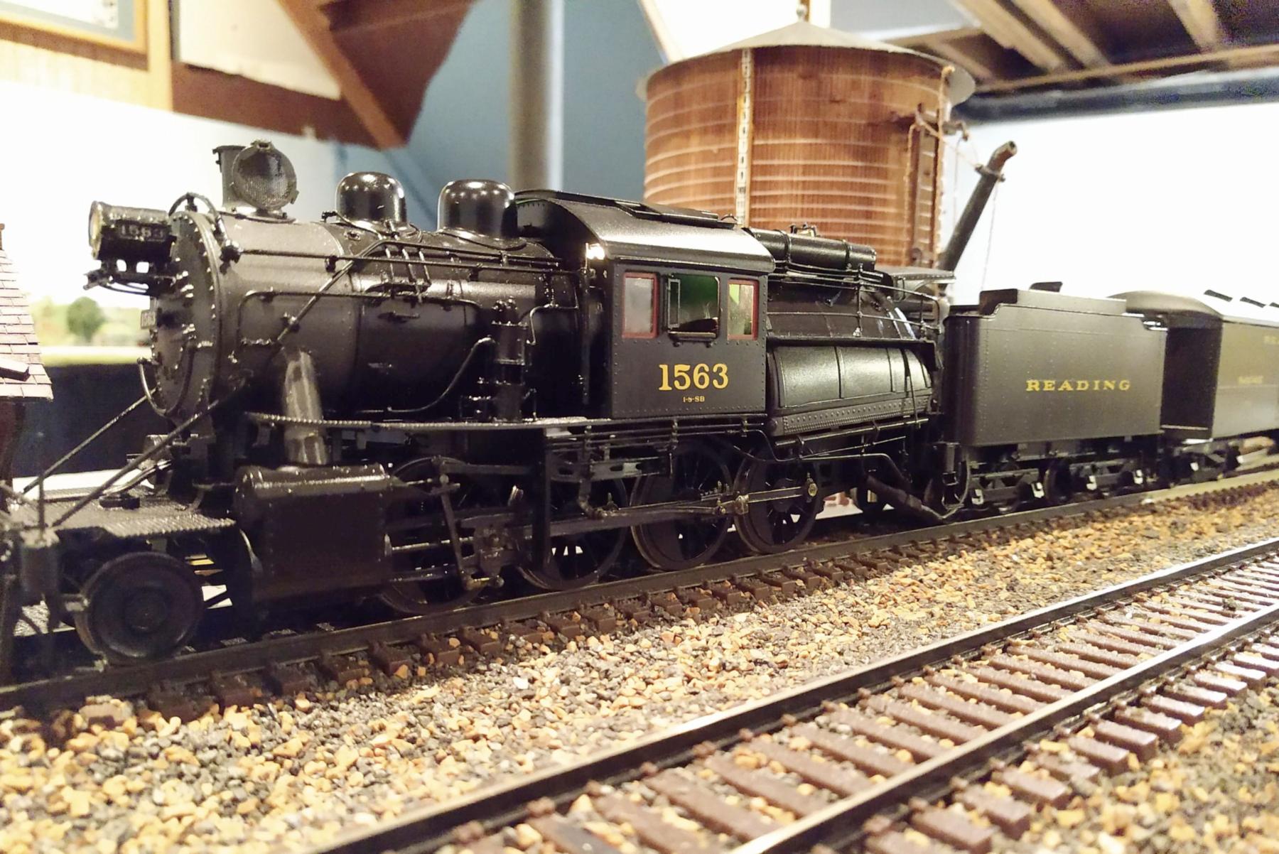 Hugh took this black & white period photo of a Reading I-10sa after it had just taken on water from the water tank. The water tank is Lehigh Valley Models kit #LVM21. The engine is also a Lehigh Valley Models kit, namely #LVM10, which owner Frank Titman first sold in 1977 as a kit and later as a ready-to-run model. The 50 prototype Reading 2-8-0 class I-10sa freight locomotives were all built by Baldwin in 1923, with the 2000 series of road numbers.