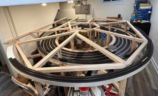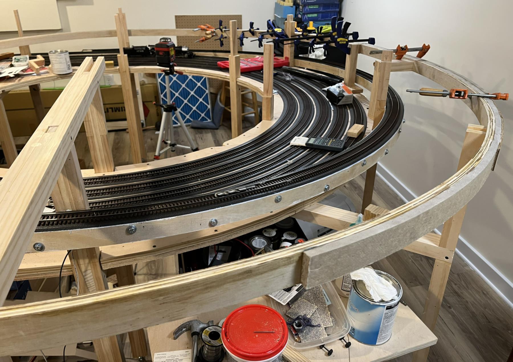 The helix area serves both as a staging yard and as the means by which trains are moved into or out of the main layout (yet to be built).