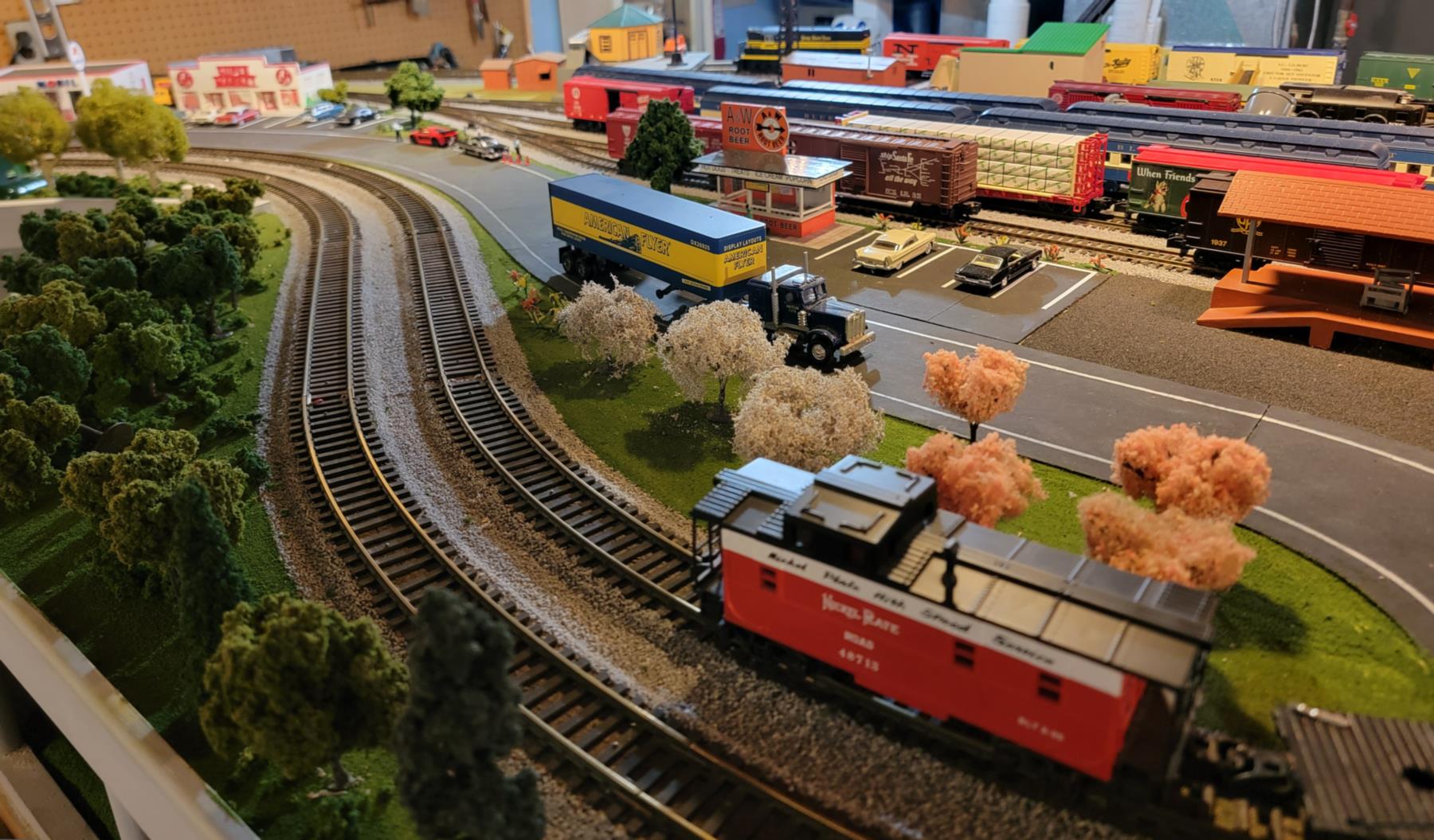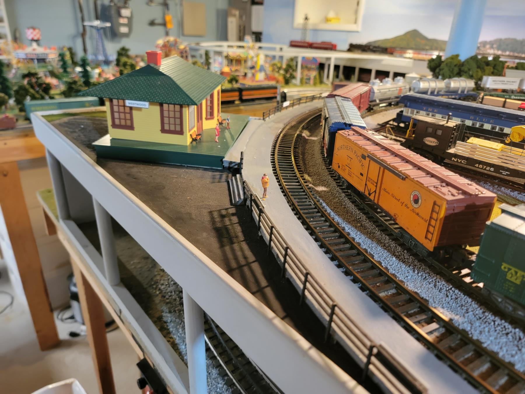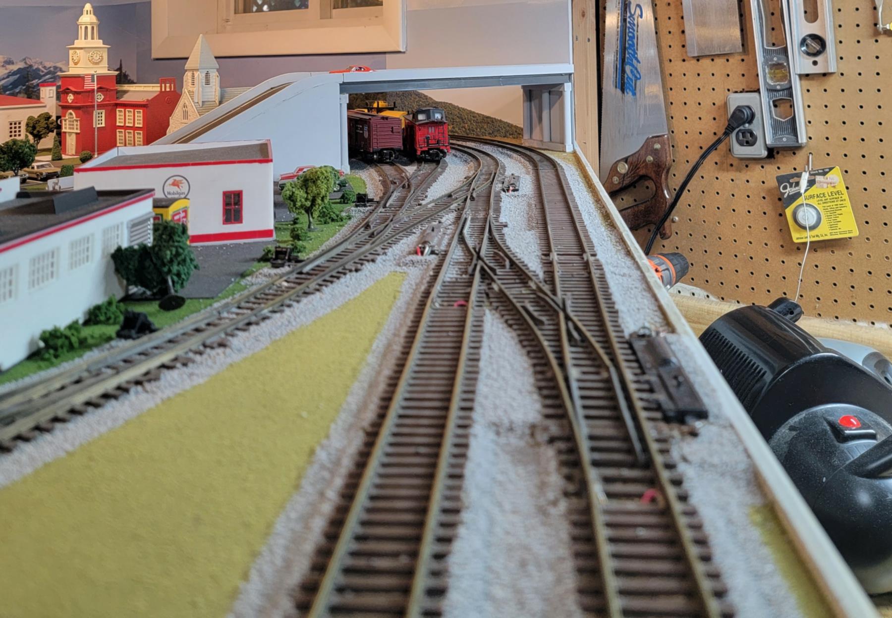 This view is from the center of the layout toward the 6-track staging yard in the back, with the double mainline visible in the foreground.