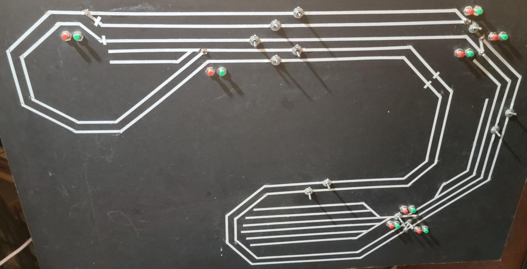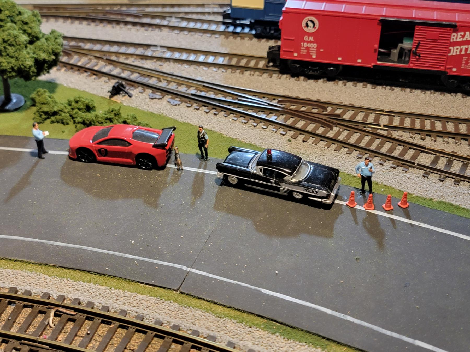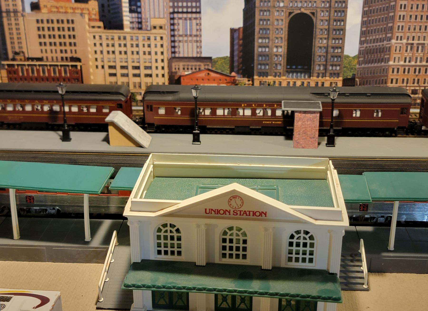 This view is from the center of the layout toward the 6-track staging yard in the back, with the double mainline visible in the foreground.