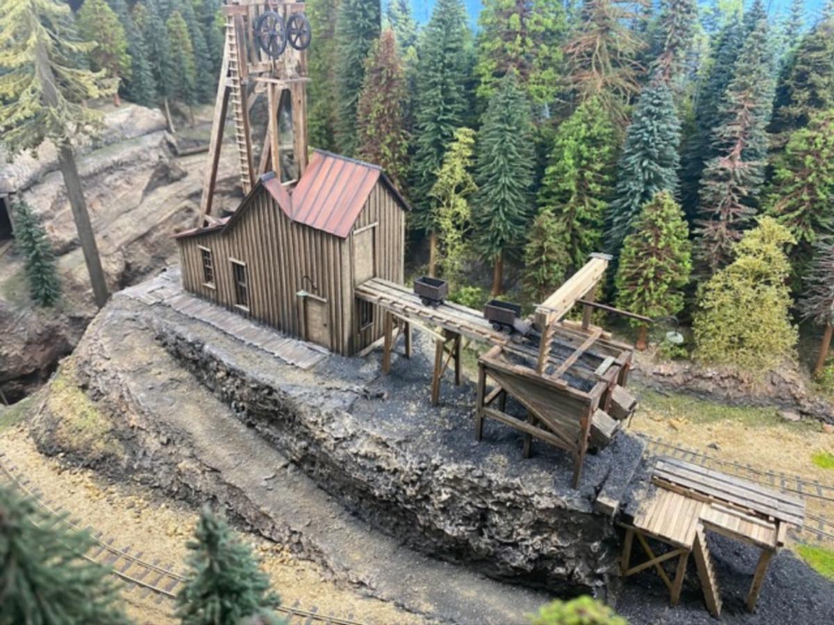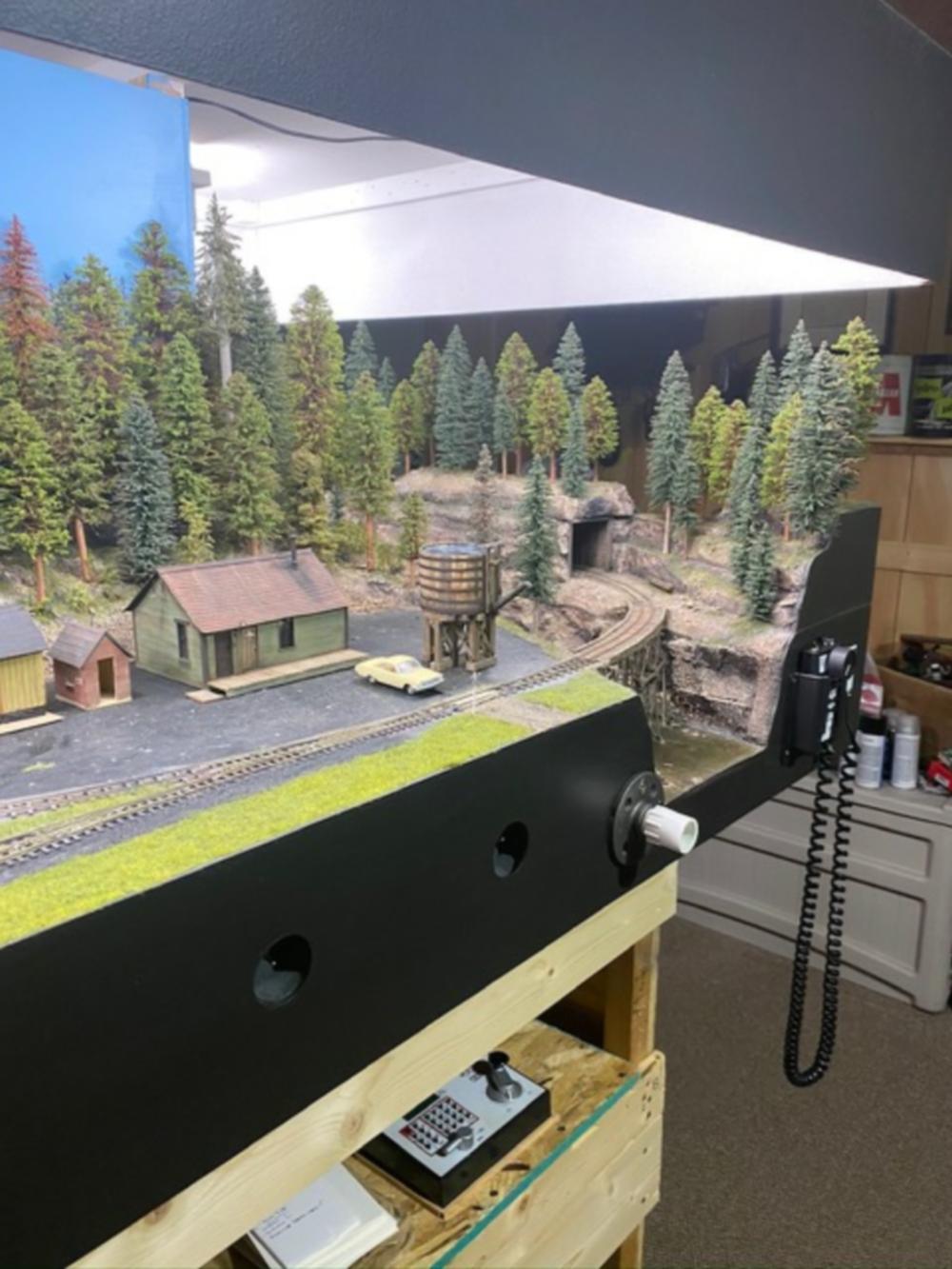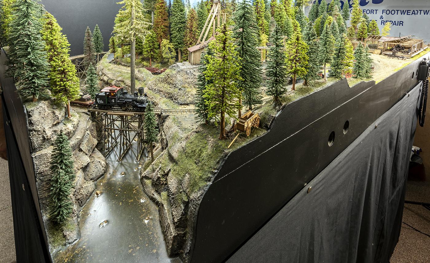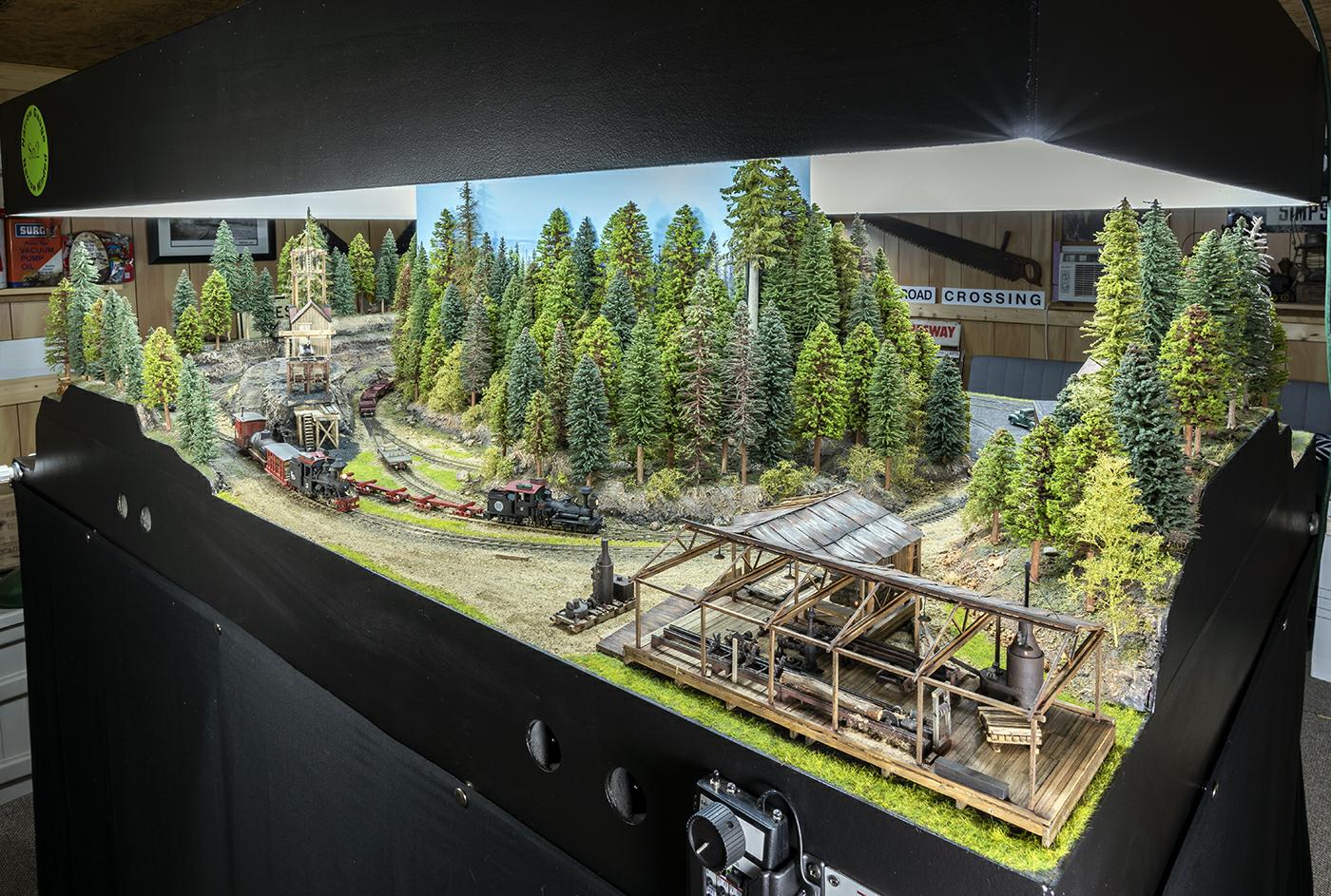 The trees are a mixture of Super Trees (with ground foam), Mackenzie trees, and scratchbuilt. Lighting is done with 100W CFL. The layout can be dismantled in sections for transportation. It has built-in support for stanchions/roping for public display.