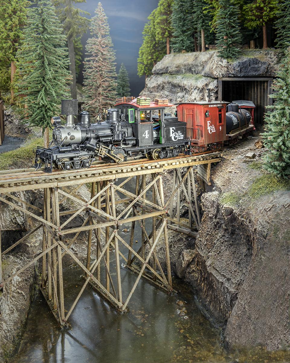 The locomotives all have LEDs and DCC installed, and were converted from HOn3 to Sn2. All rolling stock is scratchbuilt.