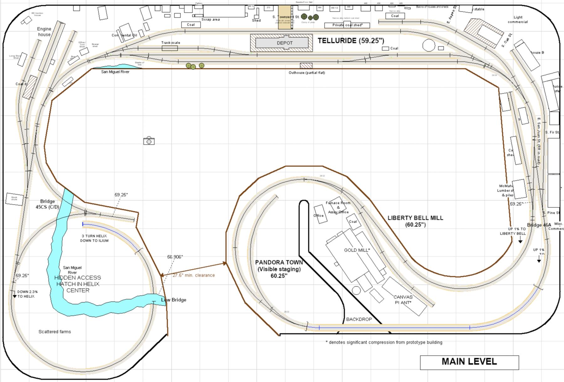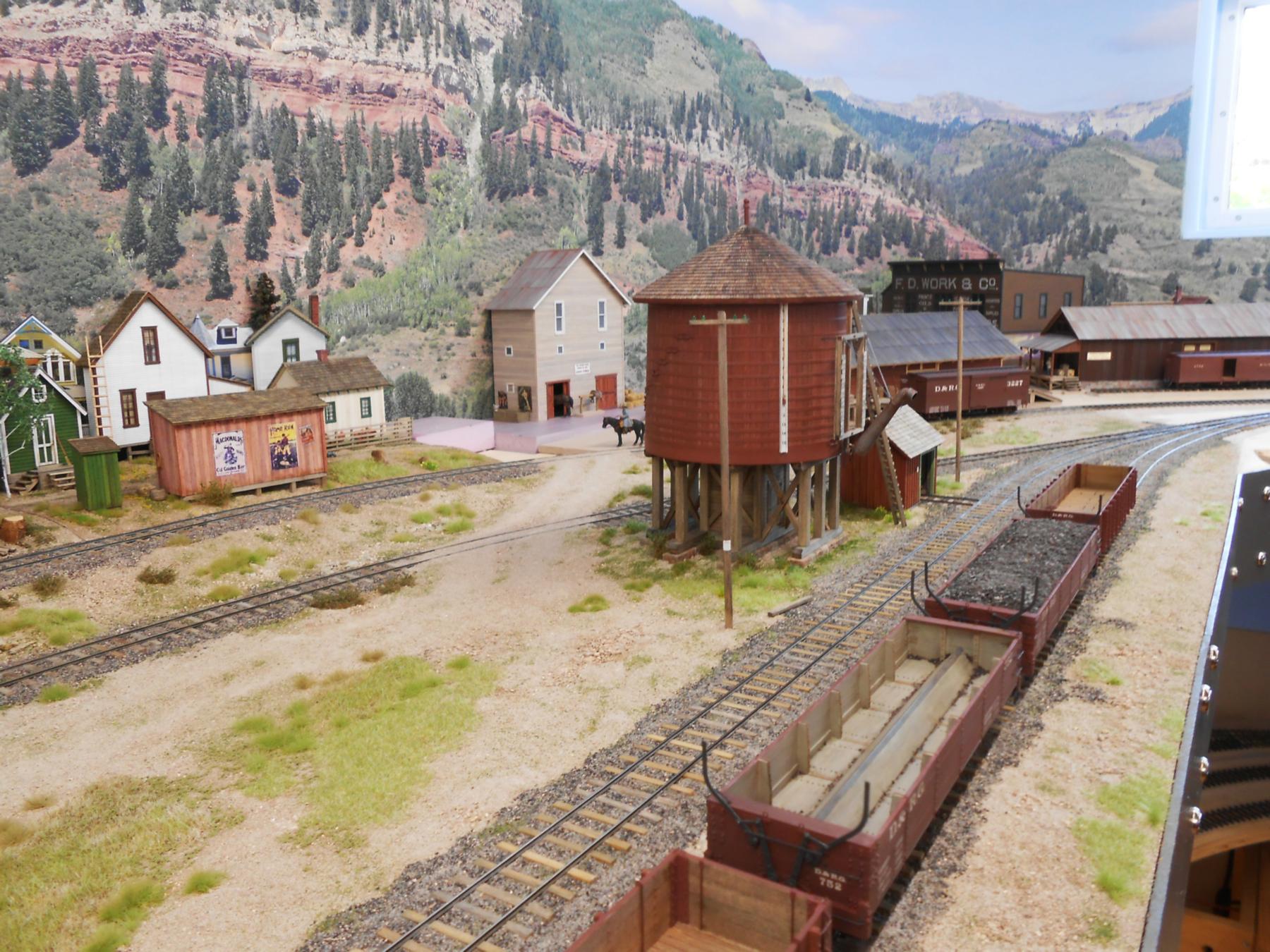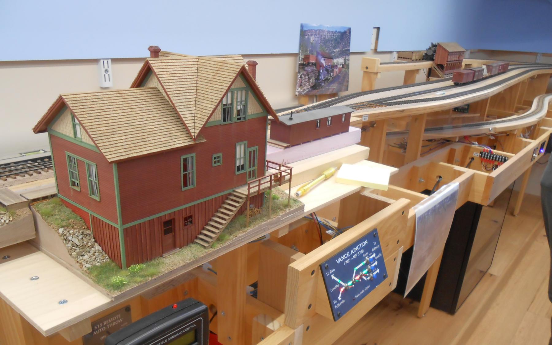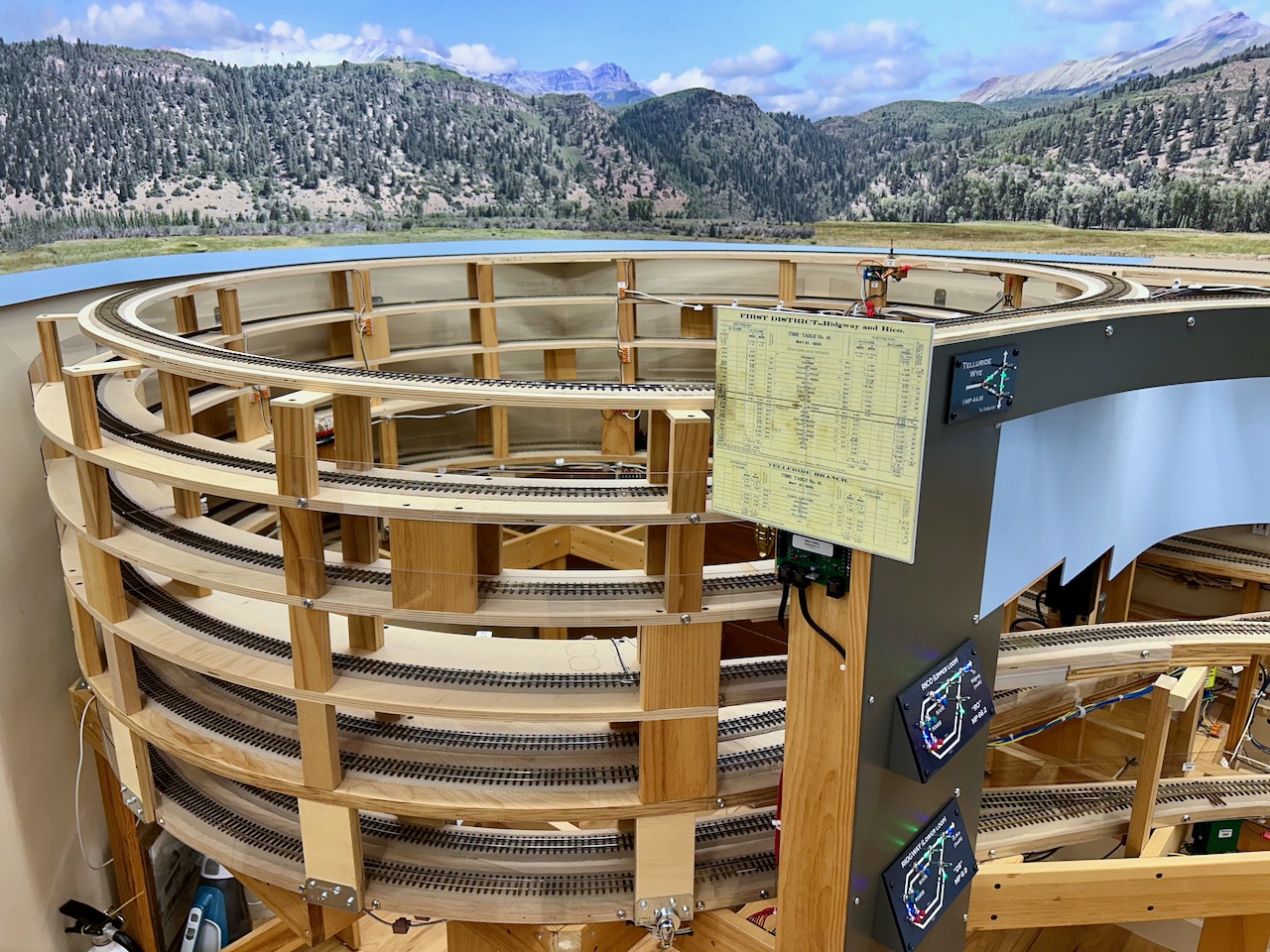 The three levels, accessed via the helix, can be clear seen on the left-hand side of the layout. Telluride is at the top level, Rico is the middle level, and Ridgway is the bottom level. The photos are oriented to show starting on the left-hand side at the top level. Note that both under-construction and later photos are intermixed, so as to show construction methods and completed scenes.