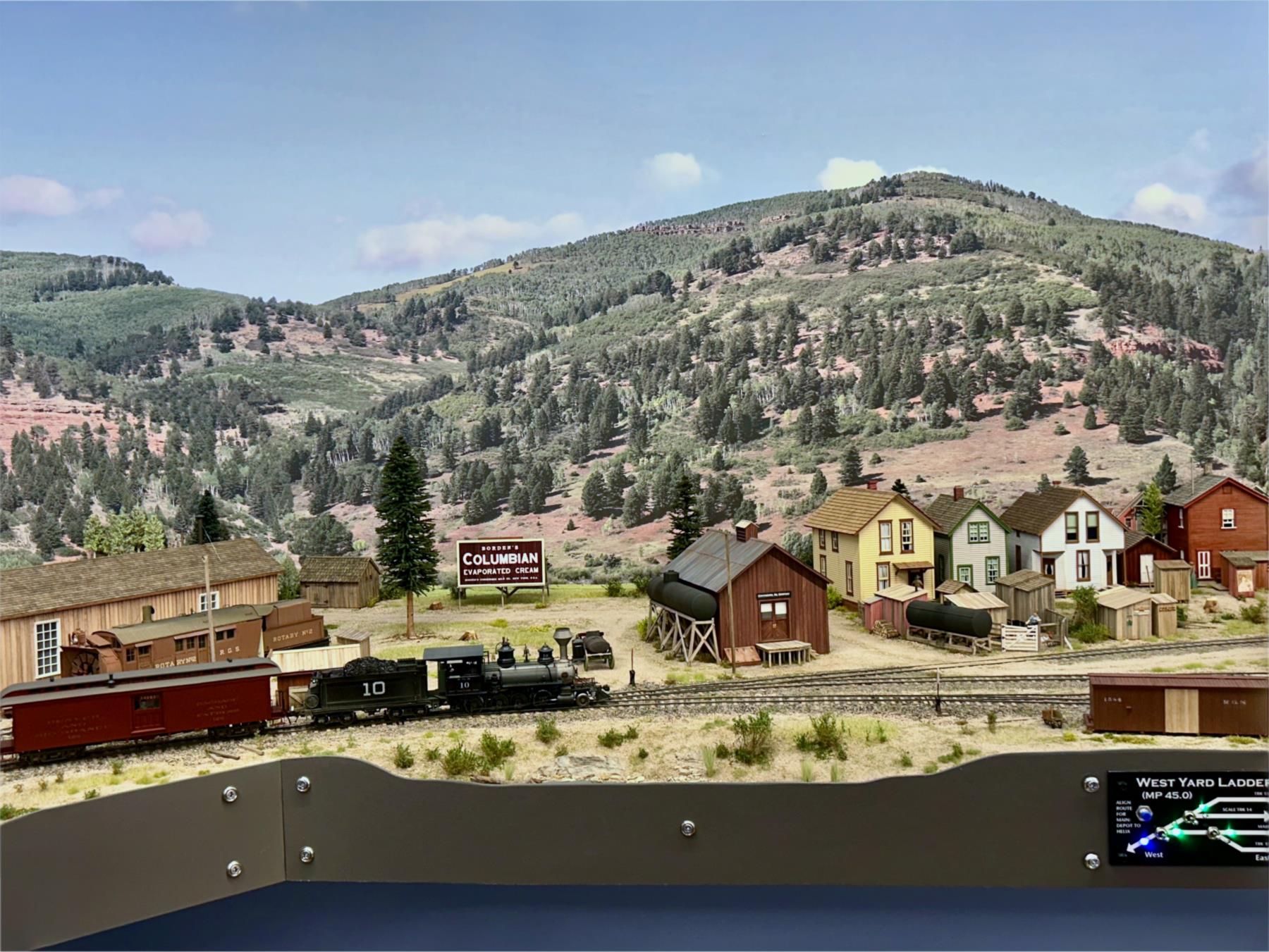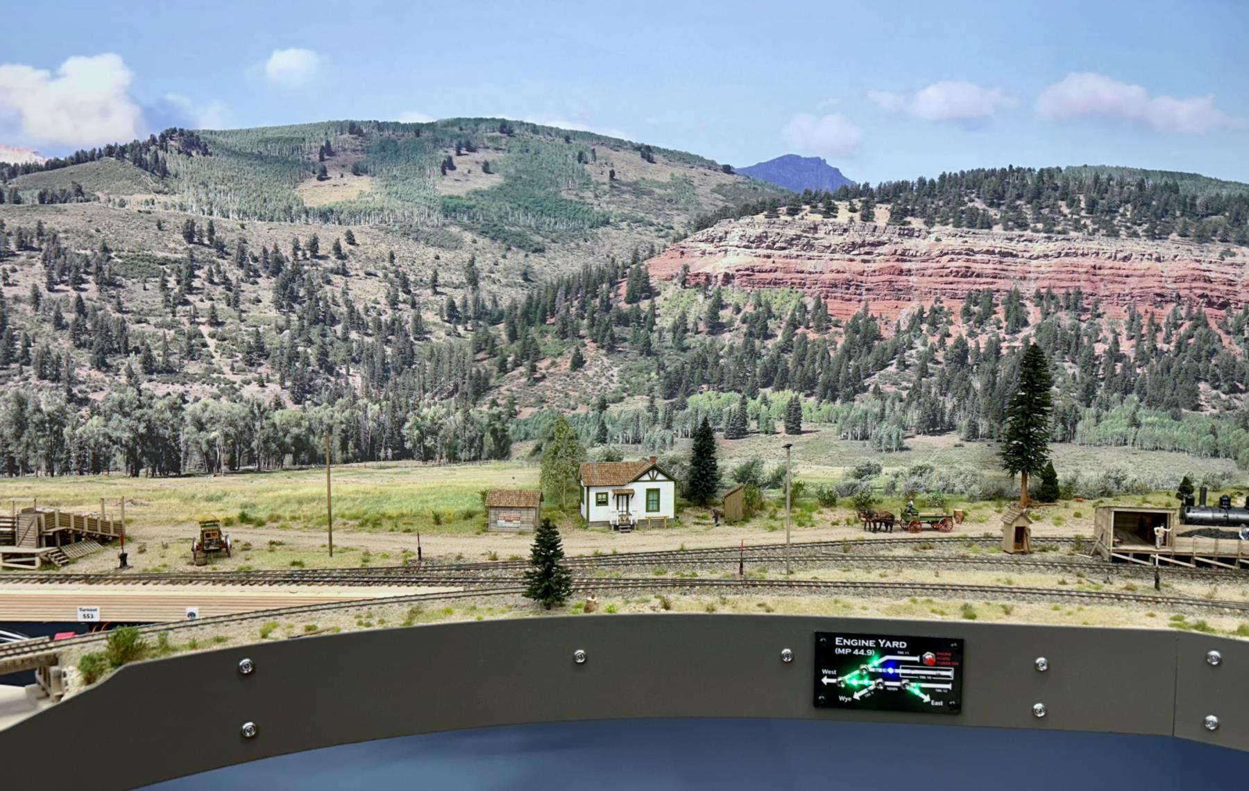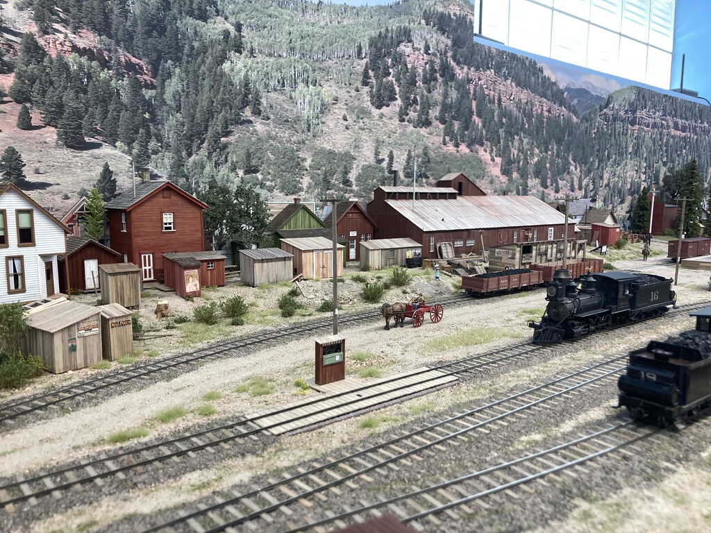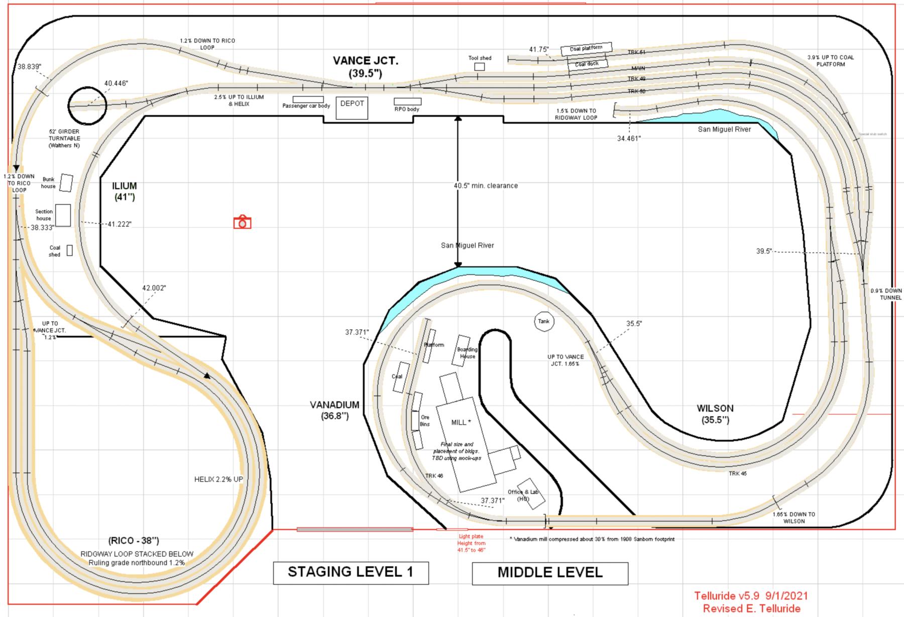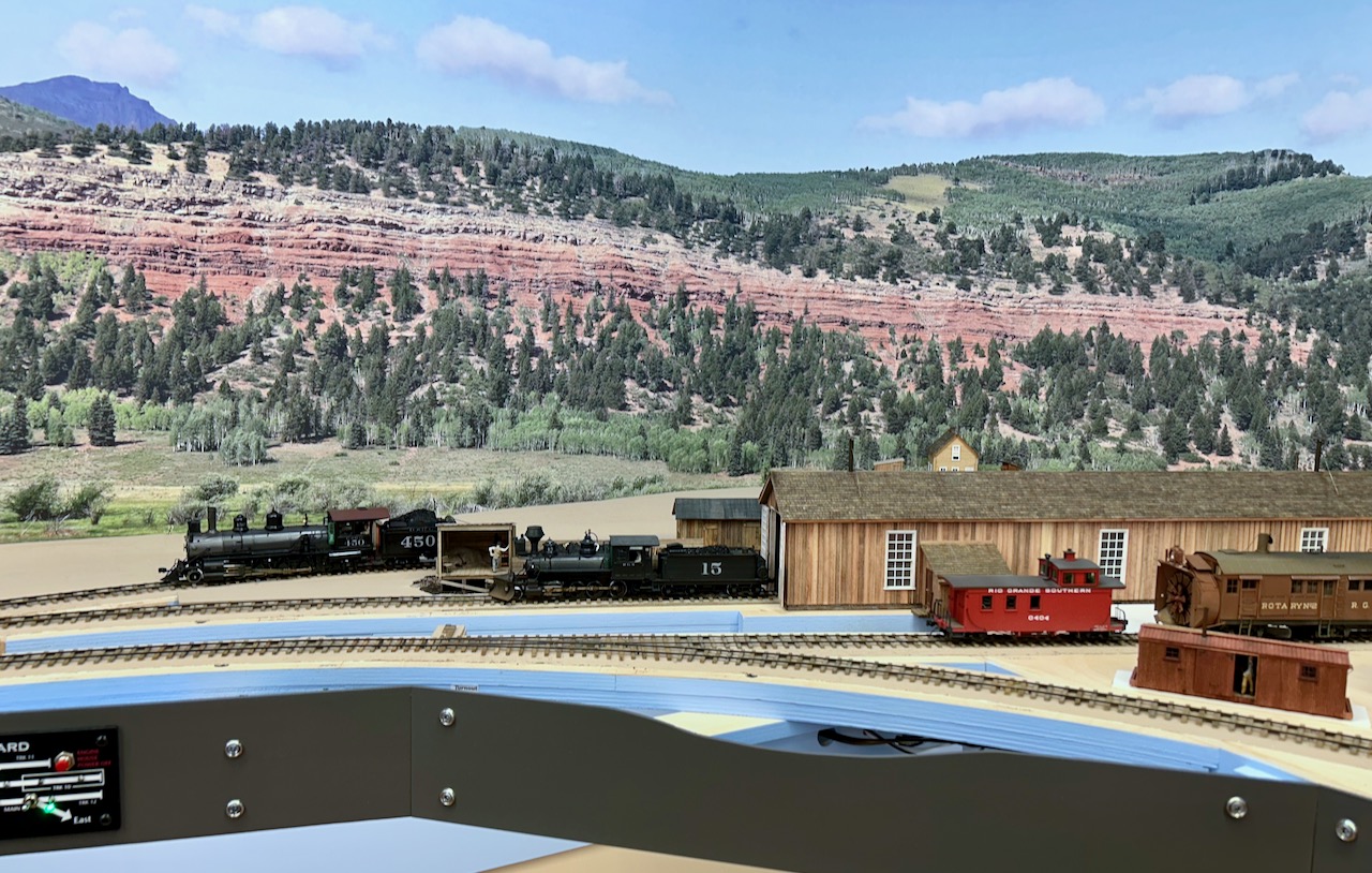 The three levels, accessed via the helix, can be clear seen on the left-hand side of the layout. Telluride is at the top level, Rico is the middle level, and Ridgway is the bottom level. The photos are oriented to show starting on the left-hand side at the top level. Note that both under-construction and later photos are intermixed, so as to show construction methods and completed scenes.