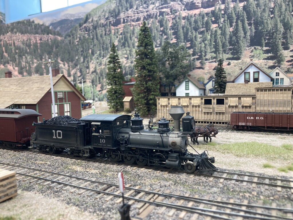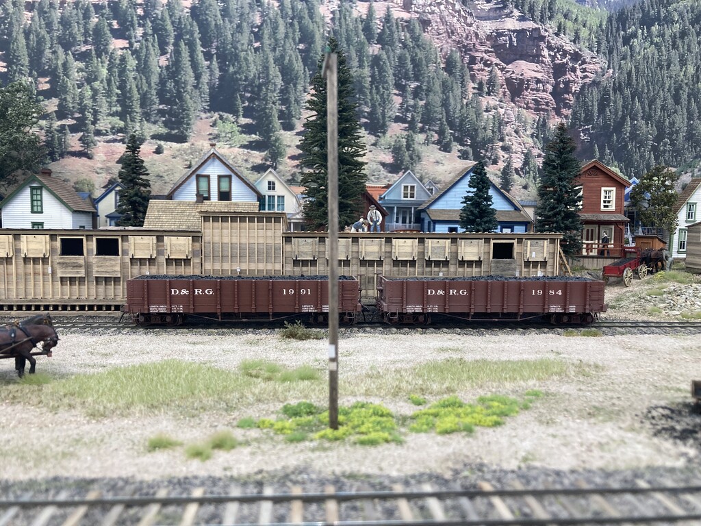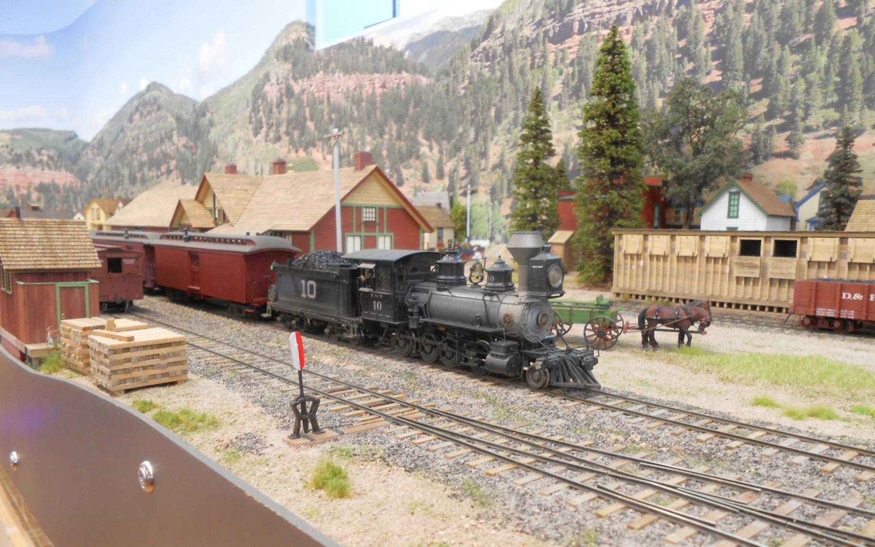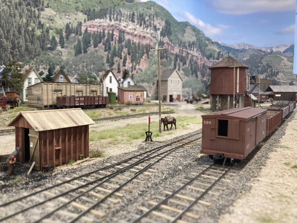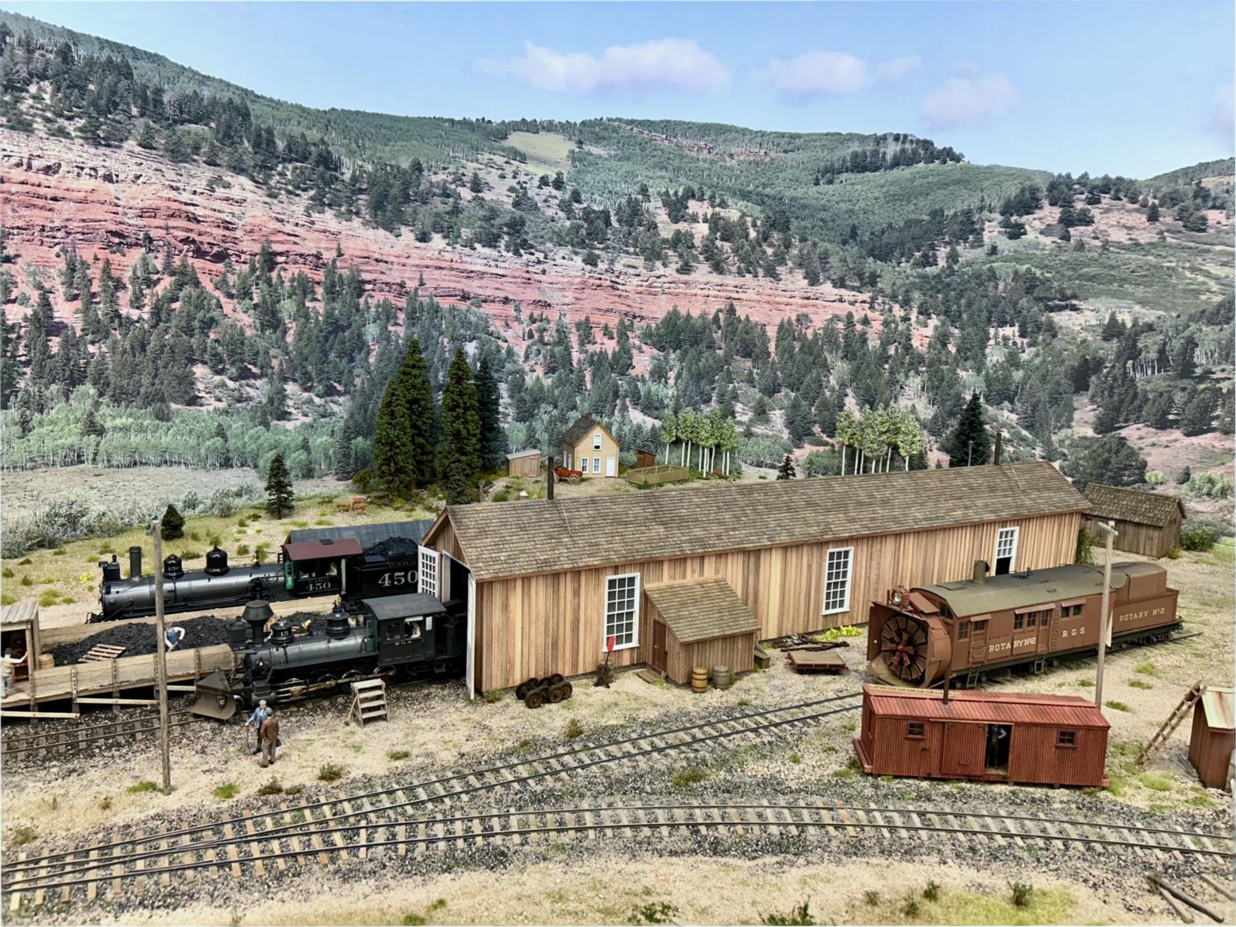 The three levels, accessed via the helix, can be clear seen on the left-hand side of the layout. Telluride is at the top level, Rico is the middle level, and Ridgway is the bottom level. The photos are oriented to show starting on the left-hand side at the top level. Note that both under-construction and later photos are intermixed, so as to show construction methods and completed scenes.