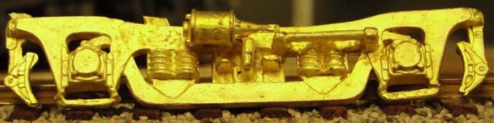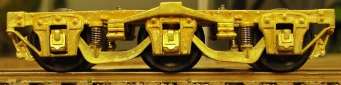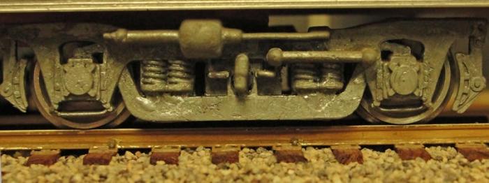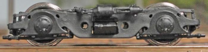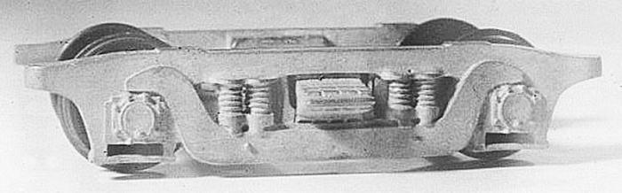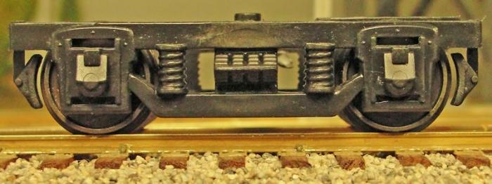 Fig. 4. American Models used to offer kits for 80-foot streamlined passenger cars. A kit version of this particular truck was standard equipment on these and continues to be available separately, assembled. It is equalized but not sprung. There is an obvious blank space in the center of the truck that the fussier modeler will want to fill; see next photo. AM Part No. 840S, available.