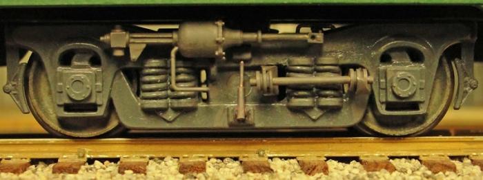Fig. 7. Although marketed as a "Budd" truck, this American Models truck is a sprung version of the same truck shown in Fig. 4. It has the requisite brake cylinder and shock strut but no torsion bar. It suffers from two problems that are easily rectified (American Models Part No. 844S, available.):