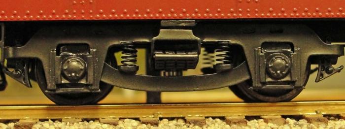 1. Its brake cylinder points in the wrong direction. Most scale modelers will want to replace the truck-mounted dummy couplers with Kadee body-mounted couplers. Doing this allows one to cut the coupler mount off the truck and rotate the truck 180 degrees.