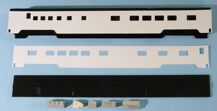 Shown are some of the components in a typical Supply Car passenger-car kit. This particular car is a diner from the NYC's 1938 20th Century Limited. Shown above are the two sides against a core body, floor below, and some of the underbody details at the bottom. Roof details also come with the kit. The Supply Car will soon have full-width diaphragm kits to go with these.