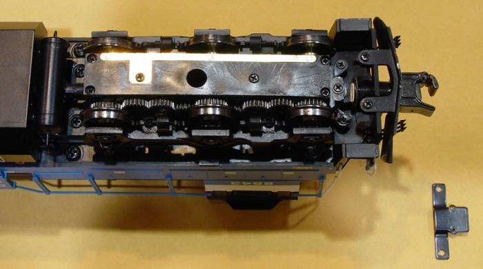 Fig. 2. This bottom view of one of the two power trucks shows the scale-contour wheels, the gear train that drives all three axles, and the AF-compatible coupler that's mounted with a single machine screw. To replace the coupler with a Kadee 802/803/808, simply remove the screw, then use the two other machine screws, already in place, to attach the Kadee adaptor bracket (lower right). Kadees mate directly with the adaptor bracket.