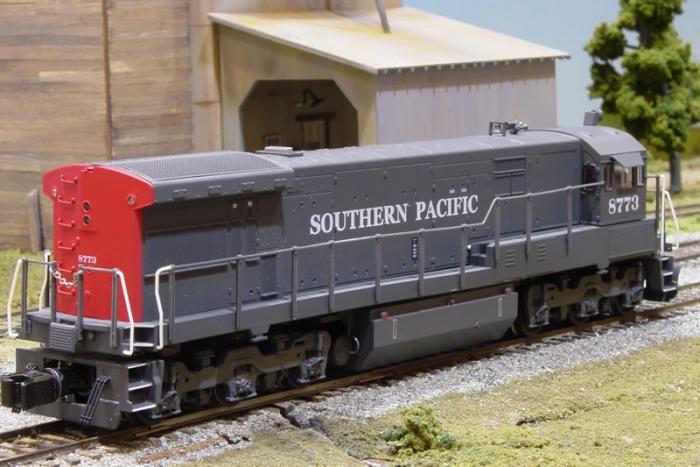 Fig. 4. Replacing the AF-compatible couplers is all that's required for Lionel's new U33C to compete with the appearance and detailing of the best of S scale products. Here we see a rear view of the Southern Pacific version parked next to a grain elevator on the Bay Area S Scalers' (BASS) layout at last February's O/S West.