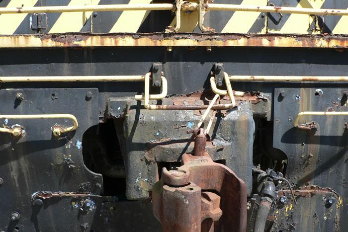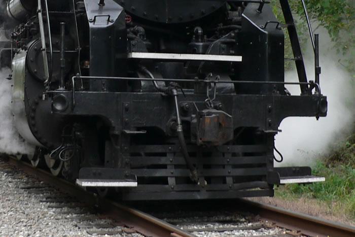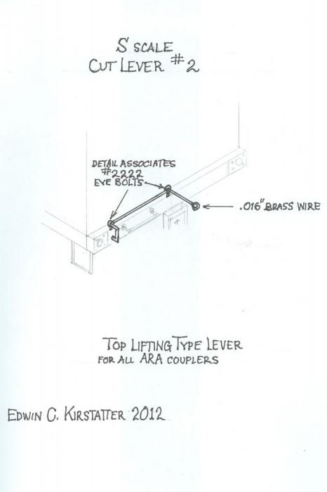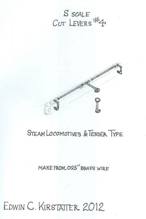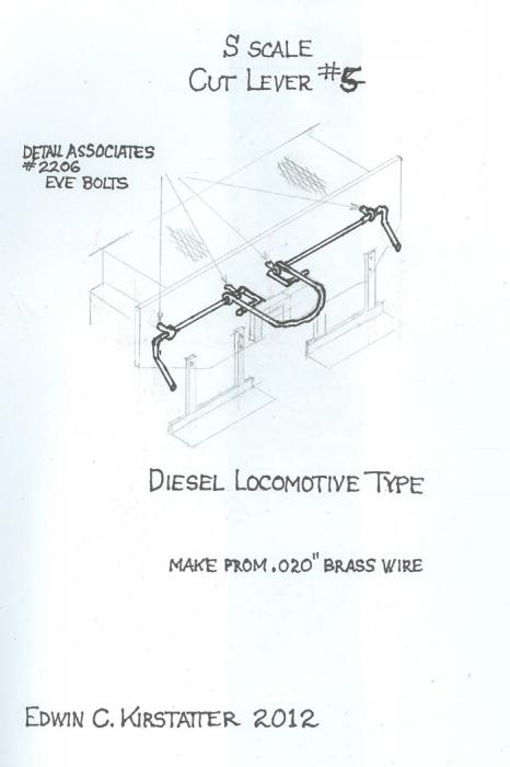 The cut levers used on steam locomotives and diesels are different from those used on cars and the levers used on diesel locomotives differ from those on steamers. The steam loco type, used on both the engine and the tender buffer beam, is a long bar going from one side to the other supported by four cast stanchions, one at each end and two in the middle. The cut bar could be lifted from either side but the brakeman had to lift the whole thing. These cut levers were heavy. Make them from .025" wire.