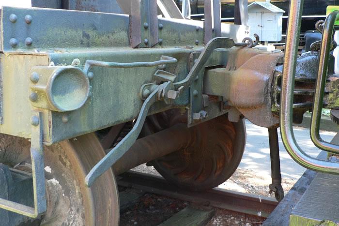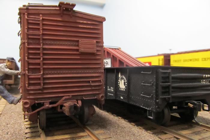 The cut bar on the "B end," or brake wheel end, is a little different. At the B end, the uncoupling bar passes over or around the handbrake staff. You will have to make a little bulge in the bar at this place to clear the brake staff.
