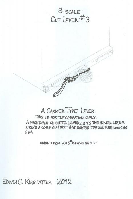There is another type of top-operated uncoupling bar called a Carmer coupler lifting lever. You will find these on many older cars and especially on the Pennsylvania Railroad. This type has a pivot at about the mid point from car side to coupler. The Carmer coupler lifting lever requires the brakeman to push down rather than lift up. This lever is more difficult to make. I cut the basic shape from .015" sheet brass. Standard Railway Supply made an etched brass version that is usable and may still be found.
