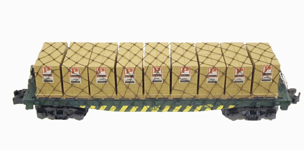 The road number is 3516, for the 35th car in the A.F. Commemorative Car series and the year 2016. The car comes with American Flyer-compatible couplers and wheels. The car is a Chicago & North Western flat car, that includes 18 pallets of plastic refractories as a load, headed to a steel mill for relining of the soaking pits (or some other industrial usage). Soaking pits were used by steel mills from the 1920s through 1975. Pallets are decorated for the Chicago-based Plibrico Co. Plibrico invented clay-based refractories around the turn of last century and was a major supplier of these materials. Pallets are scale and are held in place by "heavy duty cargo netting". Additional sets can be ordered separately, either decorated or undecorated.